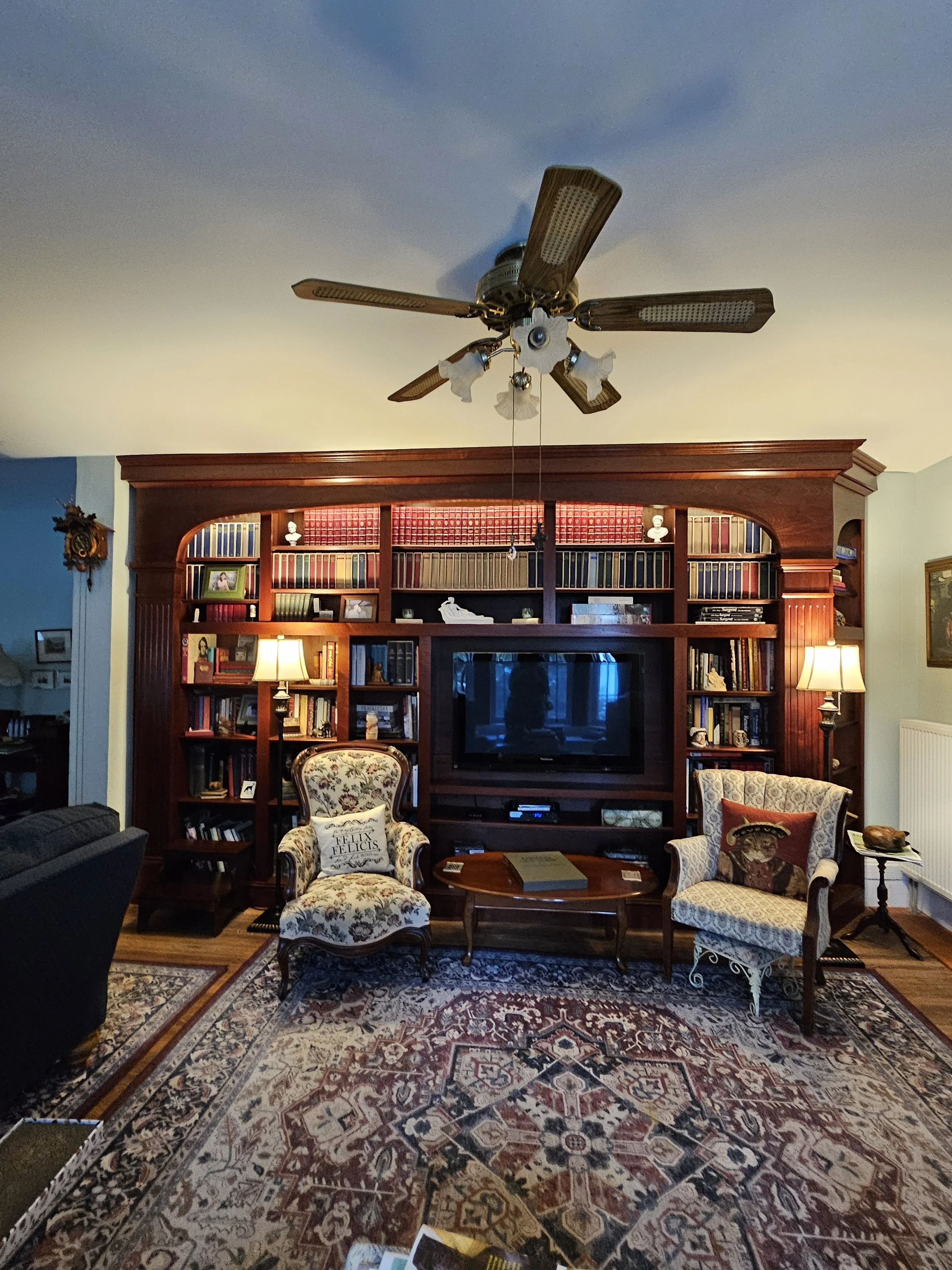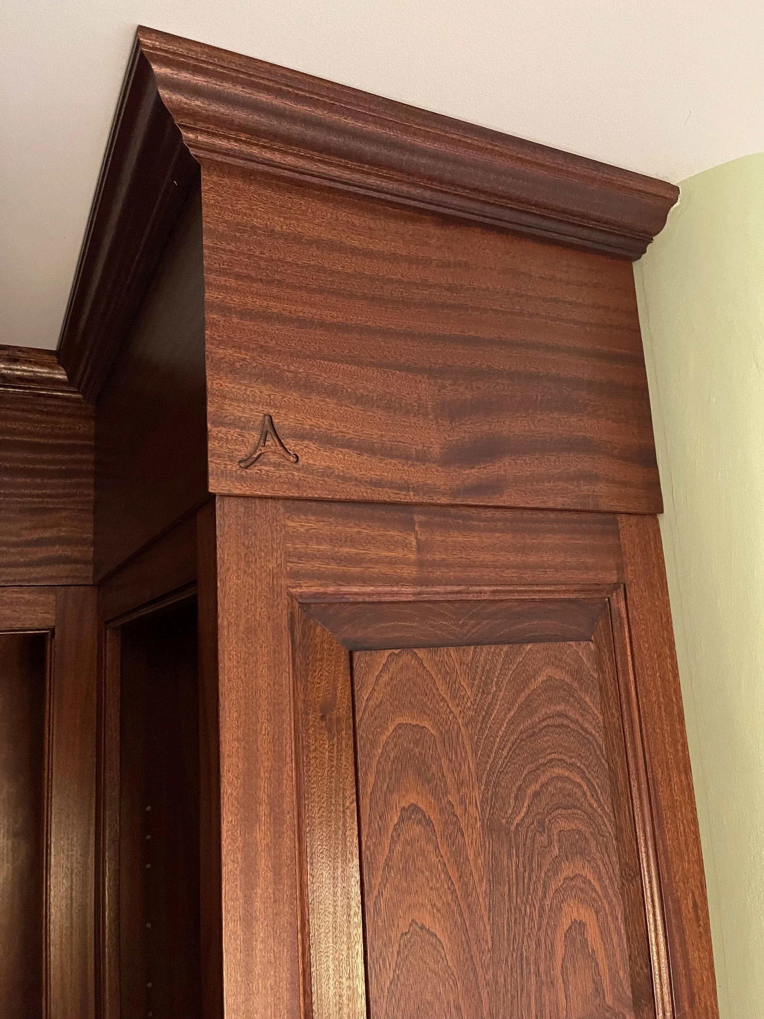 Rich mahogany bookcases with raised end panels. Personalized with carving of first letter of clients late husbands first initial